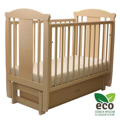 Кроватка декорирована фрезерным рисунком "Слоник". Уникальные фрезерные рисунки размером от 50 см на обеих спинках.