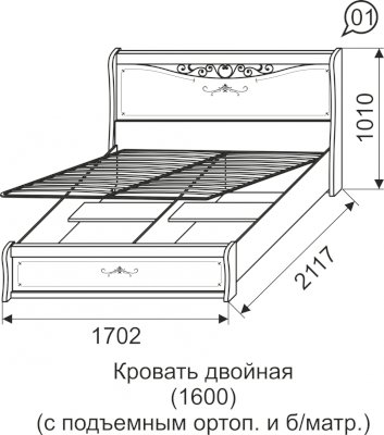 Кровать с подъемным механизмом из модульной коллекции Афродита сочетает в себе романтичный стиль и функциональность. Подъемный механизм позволит эффективно использовать пространство Вашей спальной комнаты и организовать хранение вещей во вместительном ящике. Используйте его для подушек, одеяла или крупногабаритных вещей. Этот современный механизм с ящиками дает возможность разместить все, что не поместилось в шкаф, и при этом не занимать отдельного места в комнате. Элегантный дизайн кровати с утонченным оформлением придаст Вашей комнате романтичное настроение и нежный облик. Спинка кровати украшена росписью из легких узоров в сочетании со состаренной ручной ковкой. Такая кровать создаст все условия для приятного отдыха и здорового сна.