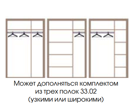 Данная модель – вместительней и функциональней двухдверного шкафа, так как имеет уже не два, а три внутренних отсека. И как еще один плюс – вариативность, ведь, как и двухдверный шкаф, данная модель предлагает вам выбор. И даже не один! Базовая комплектация состоит из трех отсеков – центрального, где две дверцы открываются навстречу друг другу, и отдельного отсека справа. И все три рассчитаны под одежду на вешалках. Штанга для вешалок выдерживает вес до 20 кг, каждая из полок – до 5 кг. Второй вариант – горизонтальные полки в центральном отсеке, и место для одежды на вешалке справа. Подойдет тем, кто предпочитает спортивный стиль и хранит одежду в основном в сложенном виде, а на вешалках располагает лишь небольшой базовый гардероб. Если же платьев и костюмов в вашем гардеробе больше, чем толстовок, джинсов и свитеров, подойдет третий вариант – центральный отсек со штангой, а справа – с полками.